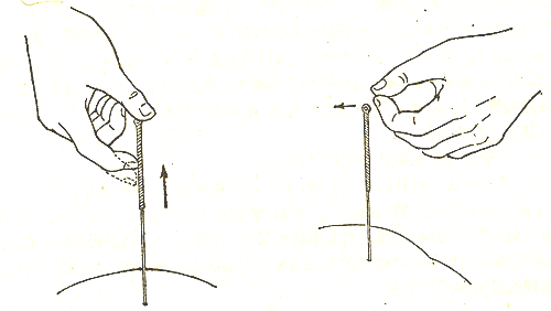 Nadeln: meist Einmalstahlnadeln, der Nadeldurchmesser zwischen 0,15 und 0,3mm in Abhängigkeit von der Länge, Länge in der Körperakupunktur meist 0,5-8cm.